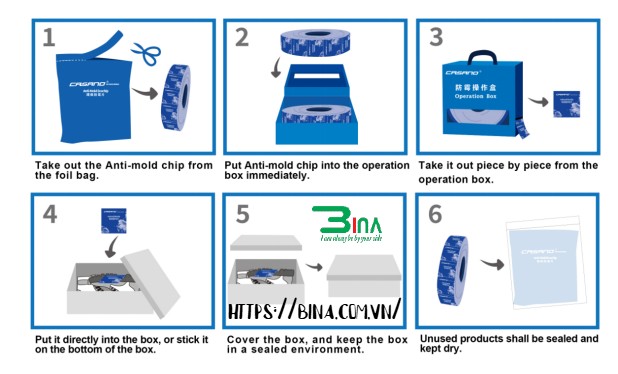 - 3.Dễ sử dụng: Không cần thiết lập phức tạp. Chỉ cần đặt nhãn dán chống nấm mốc vào bên trong bao bì và đóng lại. Nhãn dán sẽ tự động hoạt động khi độ ẩm tăng lên.